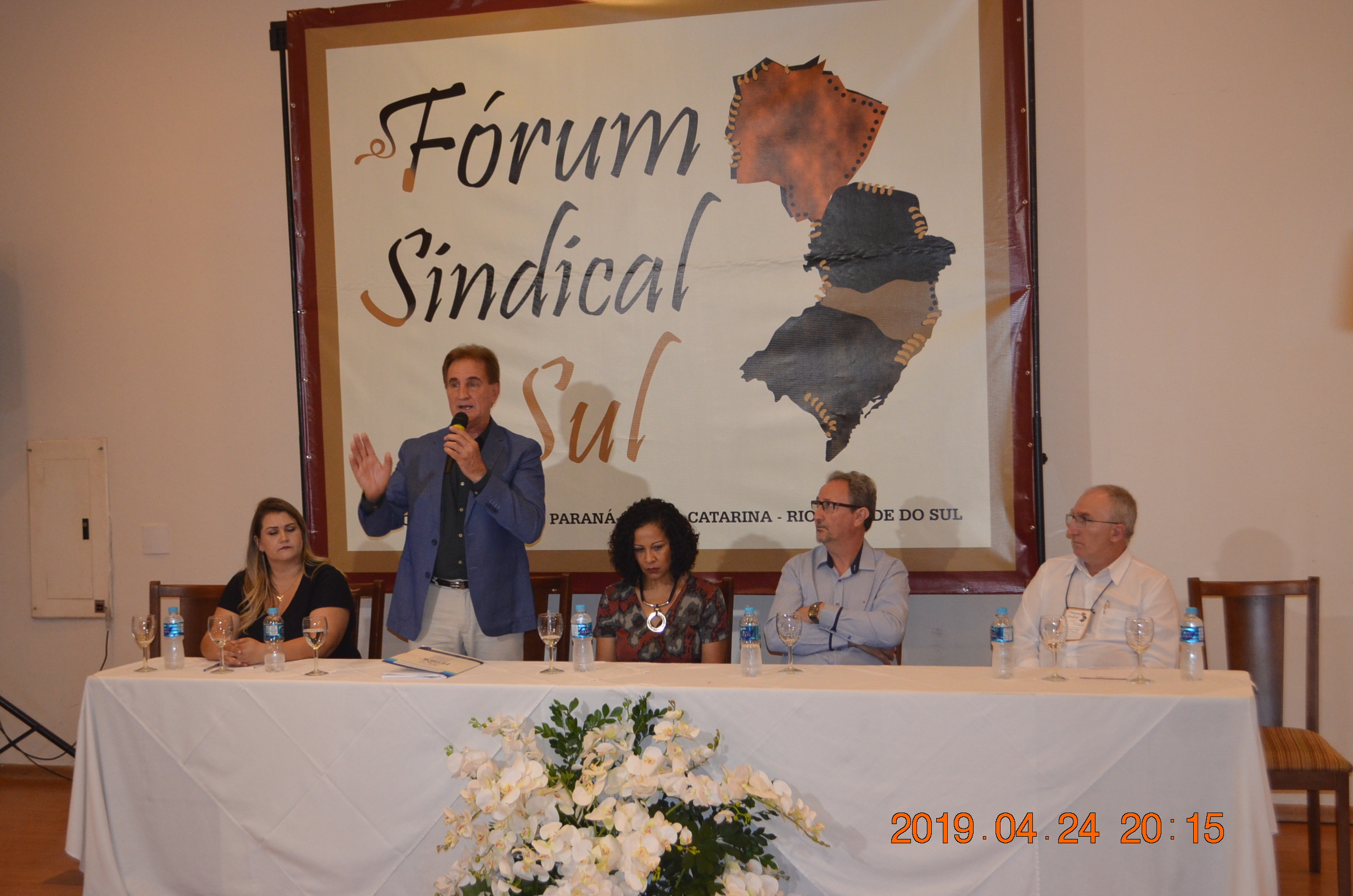 O 13º Fórum Sindical Sul dos Trabalhadores foi aberto na noite de ontem (24), em Cianorte (PR), com a participação de aproximadamente 130 dirigentes sindicais dos estados do Rio Grande do Sul, Santa Catarina, Paraná e Mato Grosso do Sul e o debate sobre os ataques do governo de ultradireita de Jair Bolsonaro contra a organização da classe trabalhadora e o custeio das entidades sindicais. O Fórum foi criado em 2006 na Federação dos Trabalhadores nas Indústrias de Santa Catarina (Fetiesc), em Itapema, inicialmente reunindo os setores têxtil, fiação, vestuário, couro e calçados mas, a partir desse ano, passa a ser uma organização eclética, com as presenças de representantes de diversas categorias de trabalhadores. Em sua 13ª edição, a organização inclui dirigentes dos trabalhadores de alimentação, ceramistas, químicos, plásticos, papeleiros, entre outras. Além da Fetiesc, na mesa de abertura estiveram os presidentes das Federações dos Trabalhadores do Calçado e Vestuário do RS, João Nadir Pires, dos Têxteis de RS, Renato Dallagnol, dos Trabalhadores nas Indústrias do MS, Cleoni Bortoli e do Sindicato das Costureiras de Cianorte (Sindcost), Elizabete Alves de Matos.