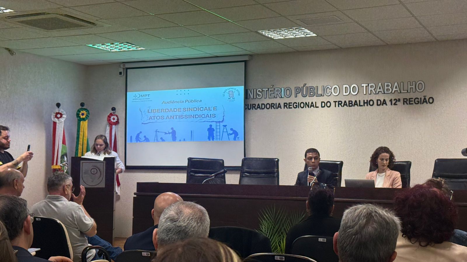 Diretores e assessores da Federação dos Trabalhadores nas Indústrias de Santa Catarina (FETIESC) participaram, na quinta-feira, 30 de outubro, da audiência pública promovida pelo Ministério Público do Trabalho em Santa Catarina (MPT-SC), em Florianópolis, que tratou do tema “Liberdade sindical e atos antissindicais”. O evento reuniu procuradores do trabalho, especialistas e representantes de diversas entidades sindicais do estado, num amplo debate sobre os desafios e garantias do exercício da liberdade sindical no Brasil.